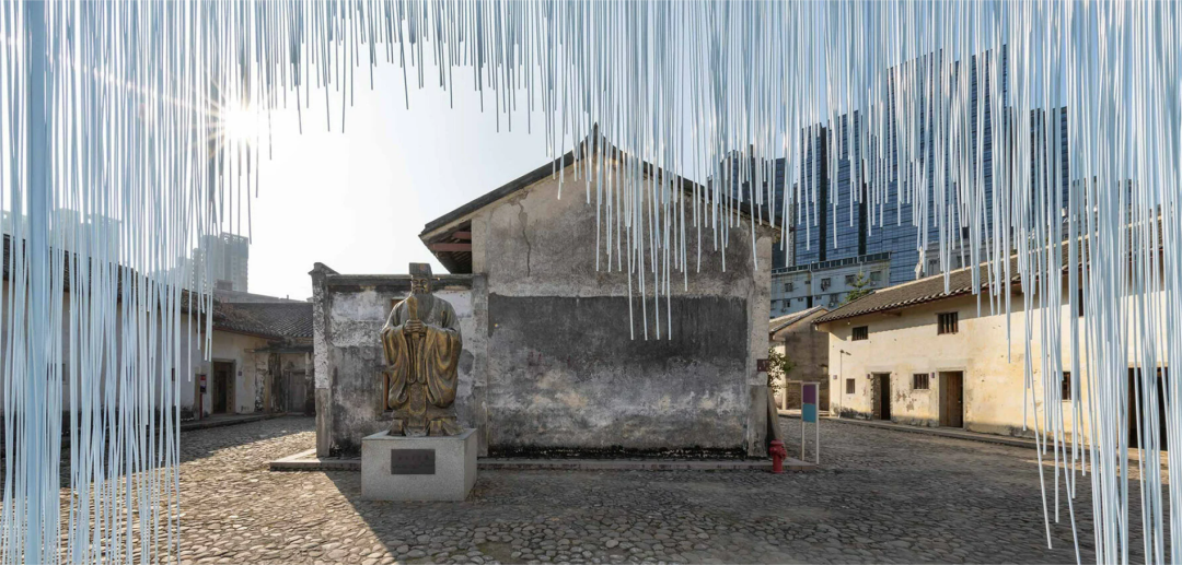 客家村落有一个悠久的传说,即把榕树种植在房屋前面,象征着繁荣与长寿。深圳的传统客家村落已有二百多年历史,是一个多家庭的封闭居住结构。HAS设计与研究组织为了这棵传说中神圣的榕树,为深圳的传统客家村落设计了这个自由框架院。它由五千根管子组成,与周围的建筑形成了强烈的对比,为百年古迹注入新活力。庭院不仅可以感受自然的美好,也可以成为客家人披绸、织印花的地方。夜晚,隐藏的照明带绘制出柔和的拱形曲线,同时照亮了侧面的曾子大师的雕像,不仅创造了一种非日常的祖宗崇拜体验,还加强了新建筑与百年客家村落之间的对话关系。